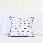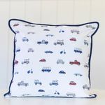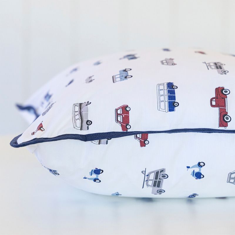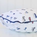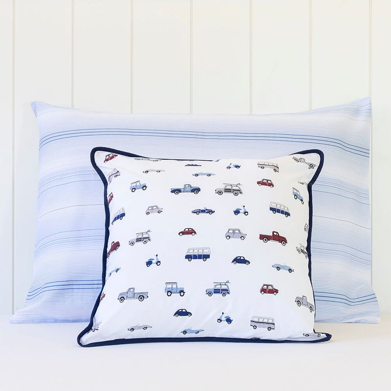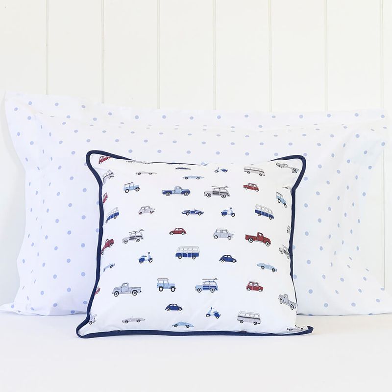 Almofada Percal 200 fios – 100% Algodão Carros estampadaPara acompanhar os pequenos em todas as fases, a Linha Bambini apresenta a Coleção Carros — estampa exclusiva Scavone Casa. A estampa traz o contrate das cores azul, vermelho, cinza, preto e azul-marinho em perfeita harmonia. Desenvolvida em tecido Percal 200 fios, 100% algodão – fio penteado, a coleção é composta por: Jogo de berço, Jogo de lençol, colcha matelassê dupla-face, edredom dupla-face, fronhas avulsas, toalhinha com capuz, toalhinha de rosto e mantinha soft dupla-face perfeita para o berço ou o carrinho.