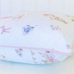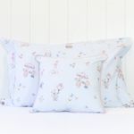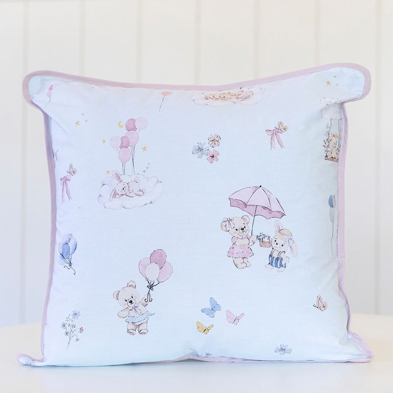 Almofada avulsa 45x45 cm estampada azul clara e acabamento com aplique de vivo rosa nos 4 lados, tecido Percal 200 fios 100% Algodão de alta qualidade.