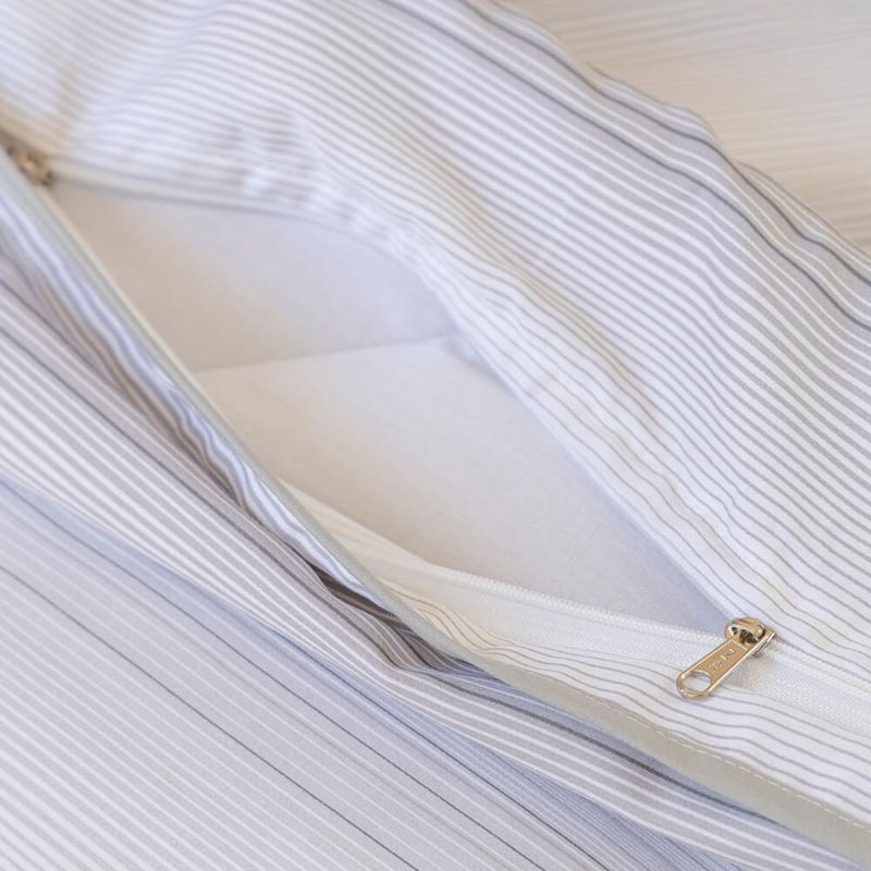 Duvet dupla-face Oxford cinza:Duvet estampado listrado em tons de cinza dos dois lados, acabamento com vivo cinza no barrado. Fechamento com zíper. Acompanha fronha modelo envelope 50x70cm estampada listrada em tons de cinza e acabamento com vivo cinza.