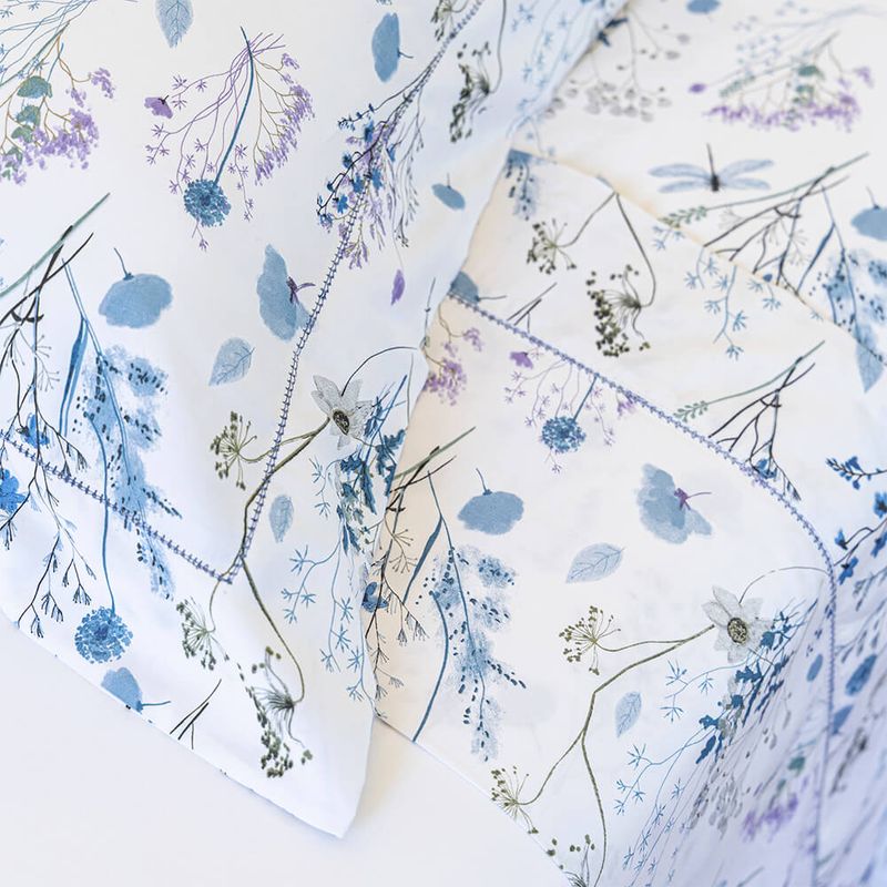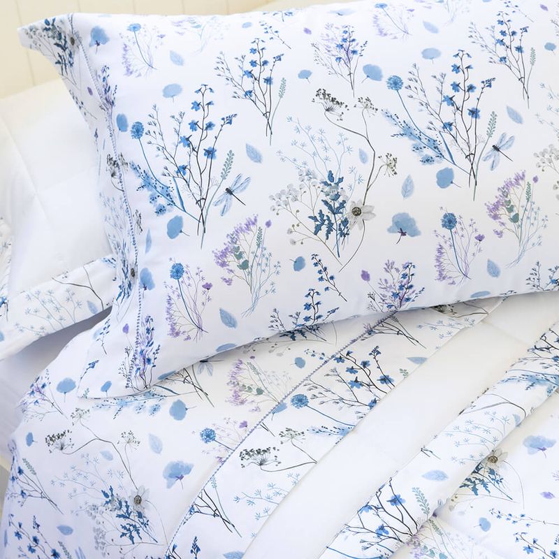 cetim 300 fios de 100% algodão. Com estampa floral em tons suaves de azul, ela combina elegância e conforto para um descanso ainda mais especial.