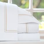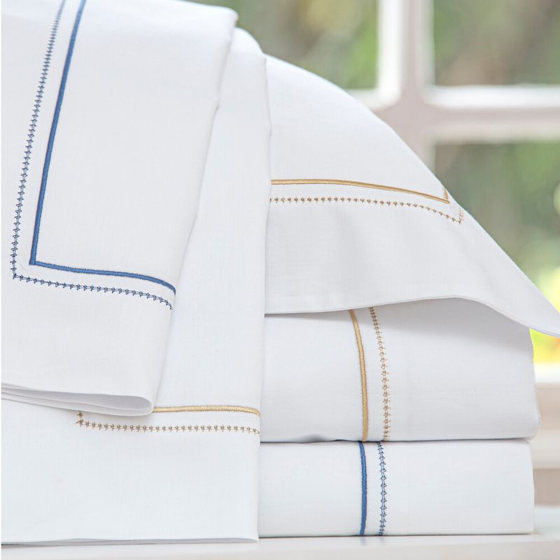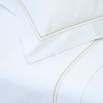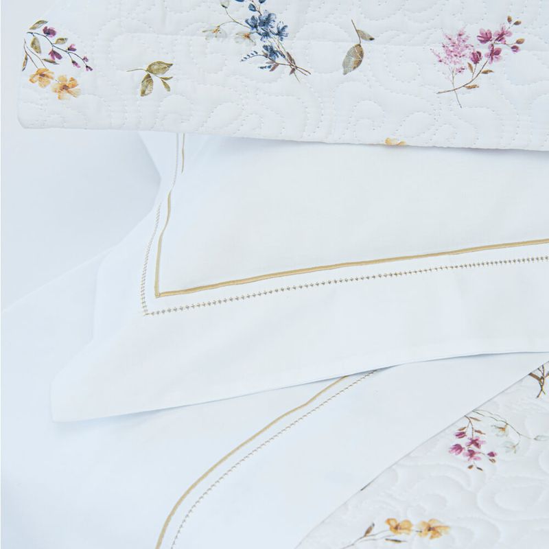 Lençol superior branco liso, vira de dobra feita acabamento duplo: ponto cheio e ponto ajour no barrado;