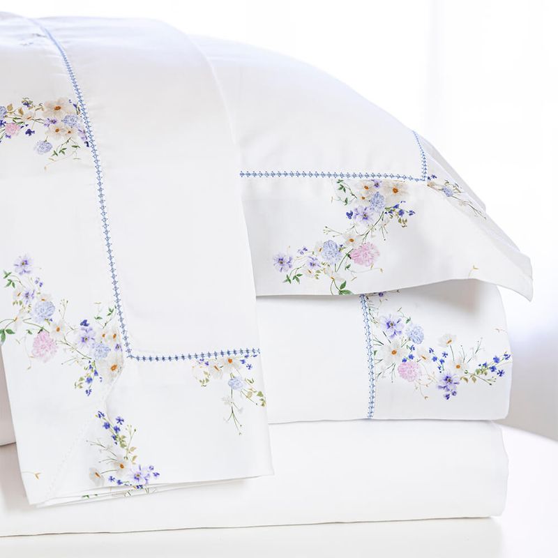 O barrado com estampa floral digital garante riqueza de detalhes e acabamento impecável. O ponto ajour azul, presente no barrado do lençol superior e nas fronhas, adiciona ainda mais delicadeza e sofisticação às peças.