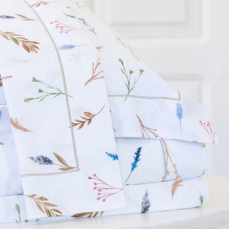 • Lençol superior branco estampado, com vira de dobra feita e acabamento em ponto cheio bordado cáqui;