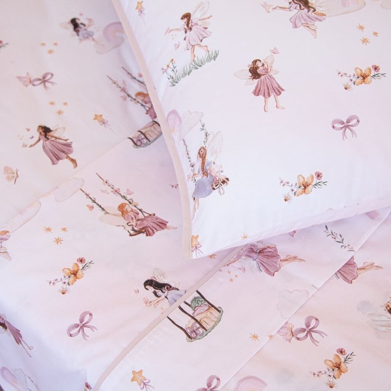 Em tecido Percal 200 fios 100% Algodão, o Jogo de lençol Fadas é composto por: