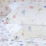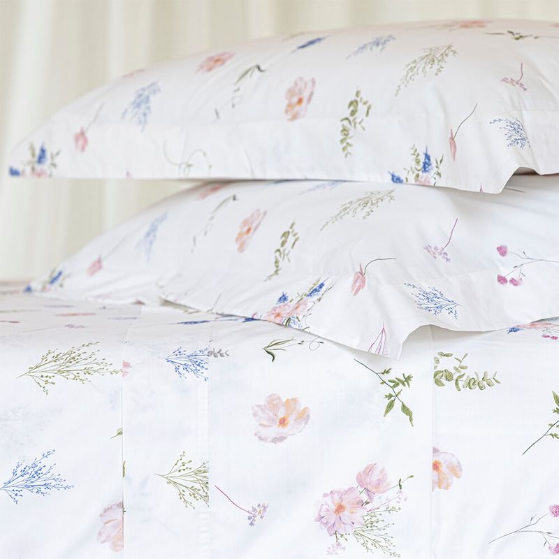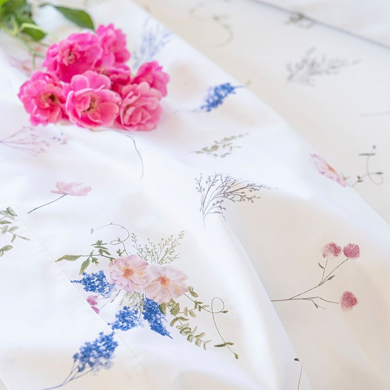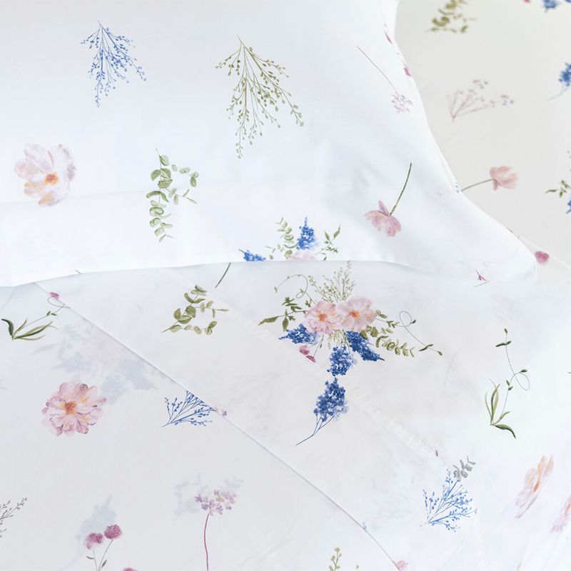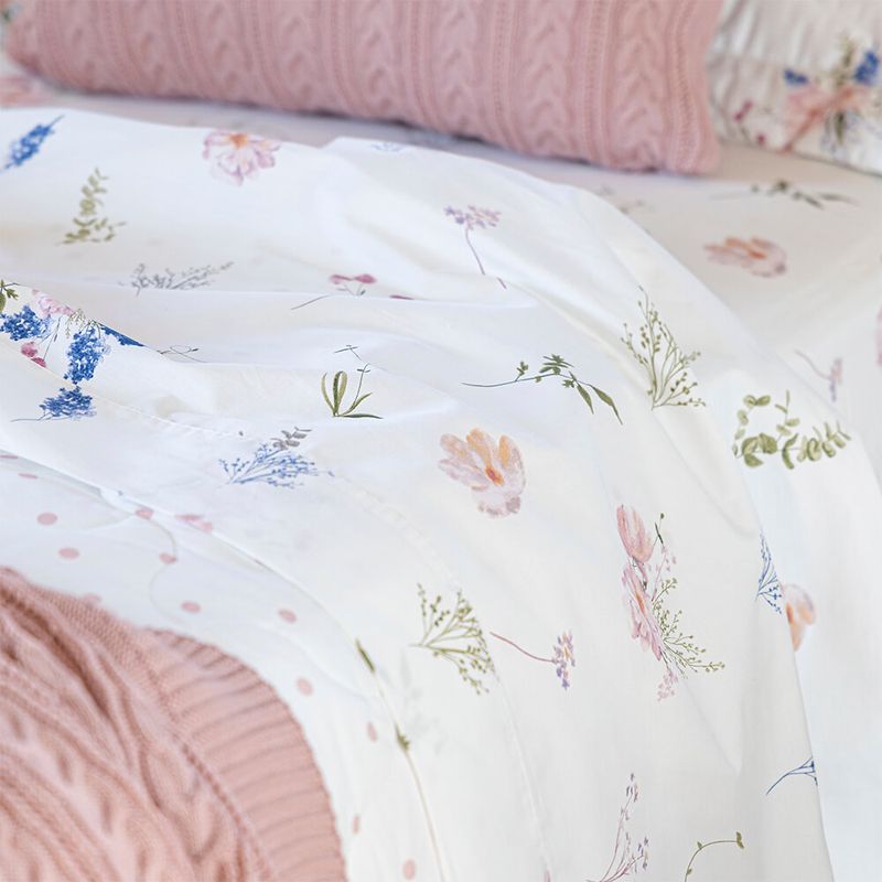Lençol superior: Off-white estampado floral, com vira para dobra feita e acabamento em costura reta.