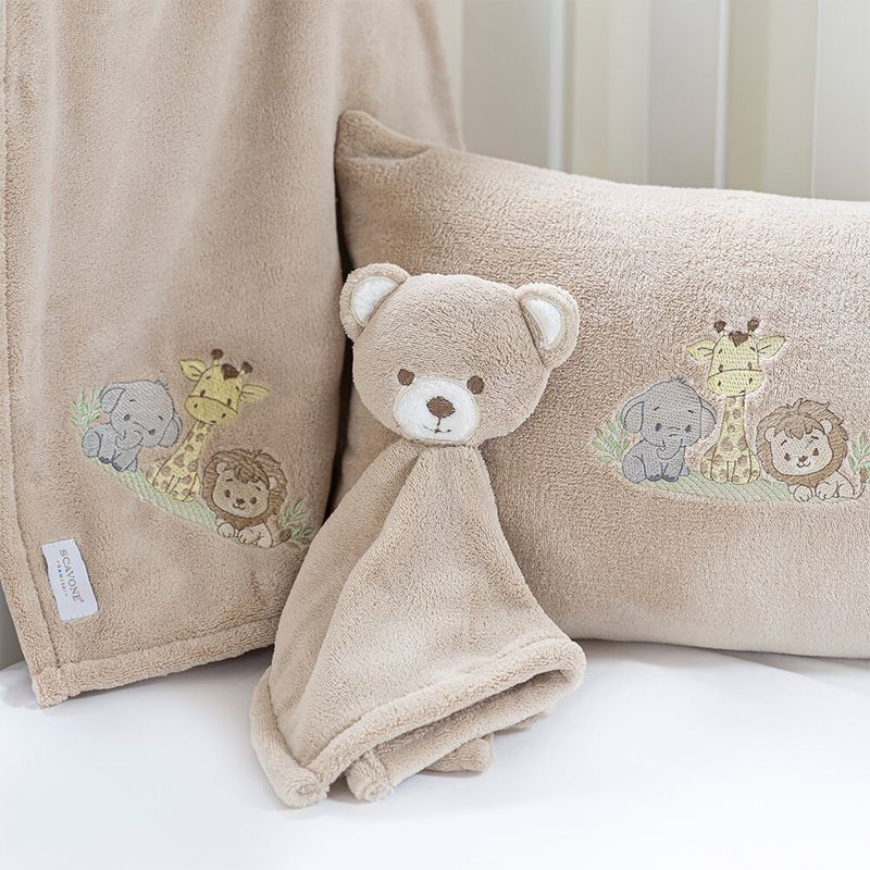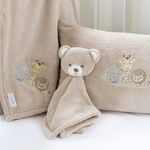 Ursinho medindo 14 x 10 cm e a mantinha 35 x 35 cm foram criadas para oferecer aconchego e segurança nos momentos de sono e nos passeios.